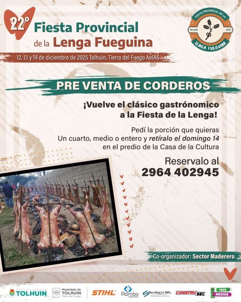 El domingo 14 se desarrollará la jornada central de la fiesta, que incluye competencias de destrezas forestales, votación y premiación de esculturas, muestra estática de productores del sector maderero y una amplia oferta gastronómica. Además, se llevará adelante la venta tradicional de corderos, con reserva anticipada disponible en el número 2964 402945.