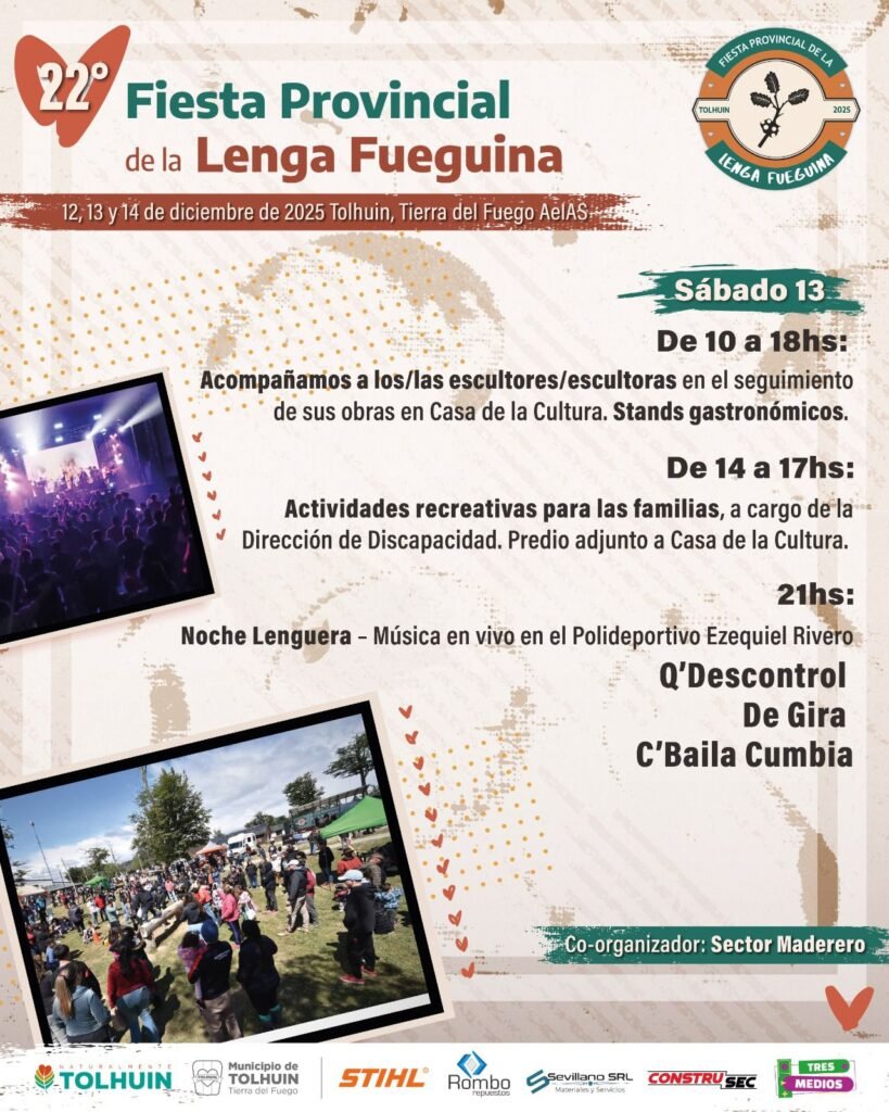 El sábado 13 estará centrado en las actividades recreativas, los stands gastronómicos y la continuidad del trabajo de las esculturas. Por la noche, el Polideportivo Ezequiel Rivero será sede de la tradicional Noche Lenguera, con música en vivo a cargo de Q’Descontrol Kuarteto, De Gira Tolhuin y C. Baila Cumbia.