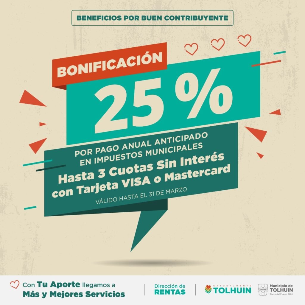 Desde la Dirección de Rentas, dependiente de la Secretaría de Economía y Hacienda del Municipio de Tolhuin, se informó que las y los contribuyentes que paguen sus impuestos anuales municipales hasta el 31 de marzo inclusive, tales como impuesto inmobiliario, tasa de servicios generales e impuesto automotor, obtendrán una bonificación del 25%.
