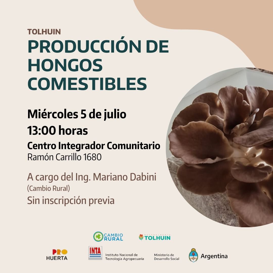 El evento se llevará a cabo el próximo miércoles 5 de julio a las 13:00 horas en el Centro Integrador Comunitario (CIC) de Tolhuin. La actividad estará a cargo del Ing. Mariano Dabini, promotor de Cambio Rural, especialista en la producción de hongos comestibles.