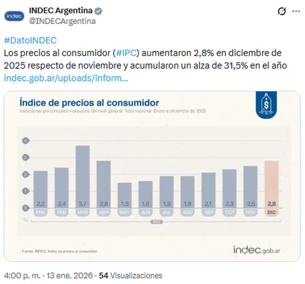 Como anticipo del dato nacional, la inflación de la Ciudad de Buenos Aires había alcanzado el 2,7% en diciembre, el mismo nivel que en septiembre. A lo largo de 2025, los precios en el distrito porteño acumularon una suba del 31,8%.