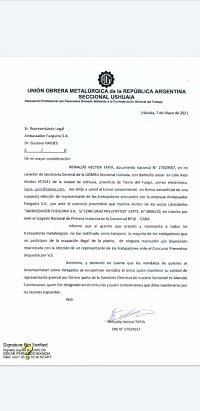 Trascendió la nota que, con fecha 7 de mayo de 2021, el titular de la UOM Ushuaia, Héctor Tapia, envió a Pablo Hadjes que “el gremio que presido y representa a todos los trabajadores metalúrgicos no fue notificado, como tampoco la mayoría de los trabajadores que no participan de la ocupación ilegal (sic) de la planta de ninguna resolución y/o disposición relacionada con la elección de un representante de los trabajadores ante el concurso preventivo dispuesto por V.S.”