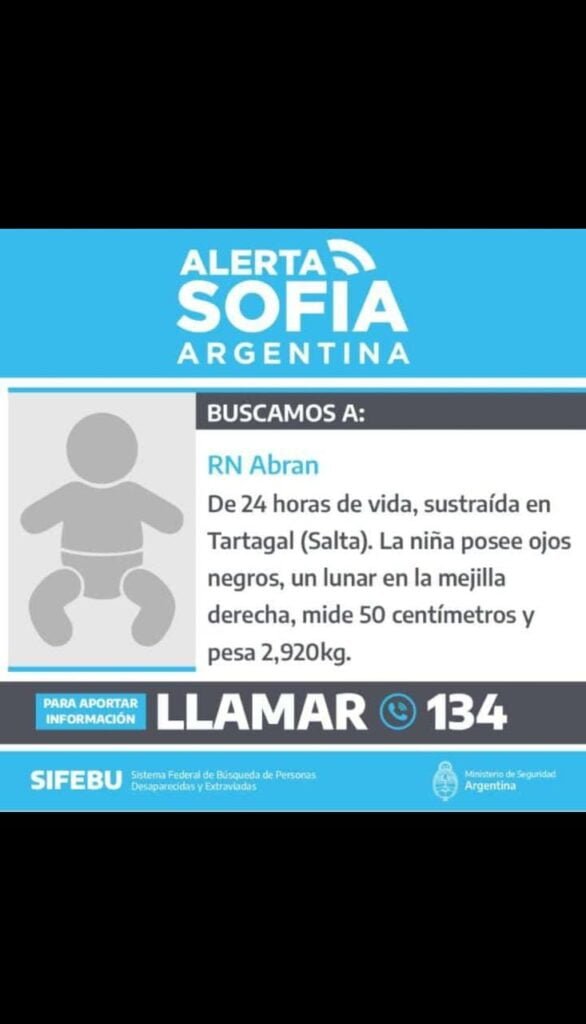 En la tarde de ayer, el Ministerio de Seguridad de la Nación, en coordinación con el Sistema Federal de Búsquedas de Personas Desaparecidas y Extraviadas (Sifebu), emitió el Alerta Sofía por la desaparición de la pequeña, que mide de 50 centímetros, pesa 2,920 kilogramos y como señas particulares, que posee ojos negros y un lunar en la mejilla derecha.