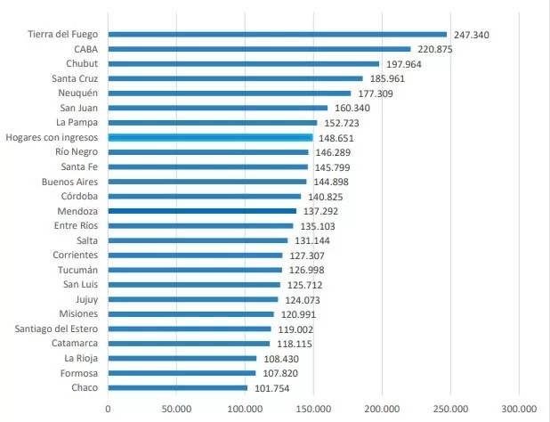 El ingreso medio total familiar de Tierra del Fuego y CABA es de $247.340 y $220.875, respectivamente, mientras que el de Chaco y Formosa es de $101.754 y $107.820.