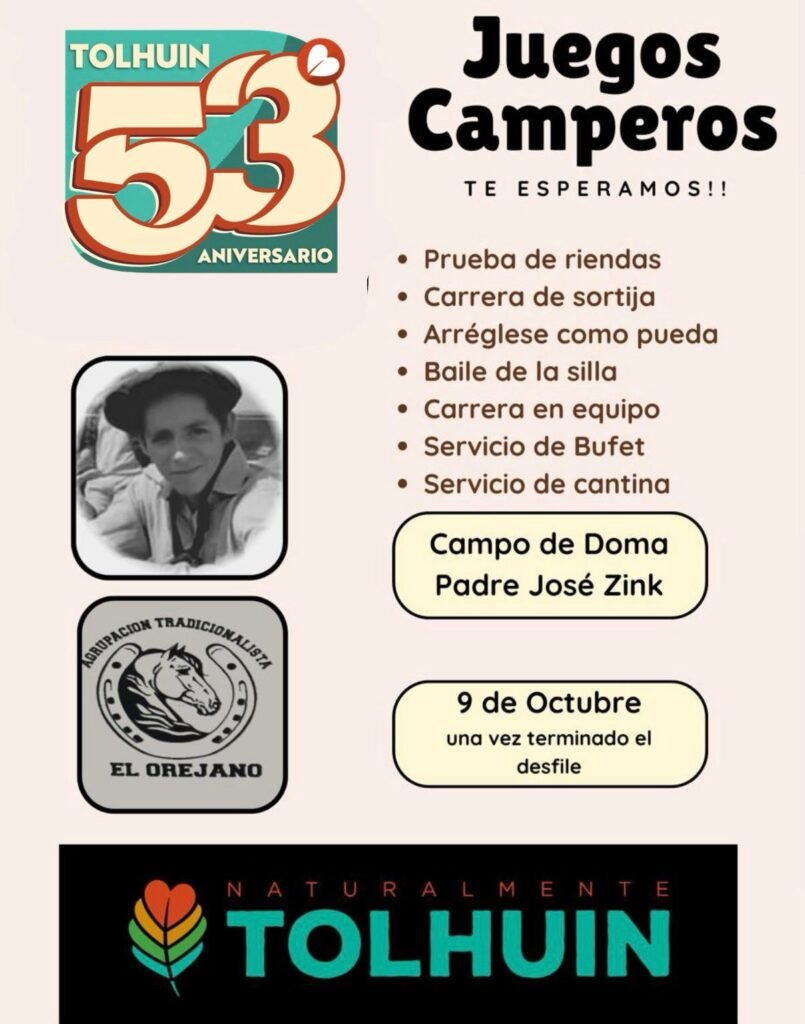 Una vez finalizado el desfile, la agrupación tradicionalista “El Orejano”, con el acompañamiento del Municipio, invitará a toda la comunidad al Campo de Doma “Cura Gaucho José Zink”, donde se desarrollarán juegos de destrezas criollas como prueba de riendas, carrera de sortija, “arréglese como pueda”, baile de la silla y carrera en equipo, además de contar con servicio de buffet y cantina.