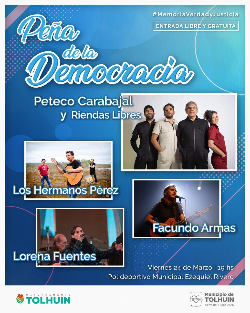 Desde el Municipio de Tolhuin confirmaron que la “Peña de la Democracia” será de entrada libre y gratuita en el Polideportivo Ezequiel Rivero, y contará con servicio de buffet a beneficio, de manera que la comunidad pueda disfrutar de una jornada de música y encuentro.