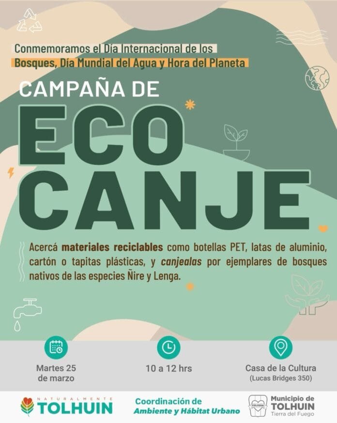 En el marco de las conmemoraciones por el Día Internacional de los Bosques (21 de marzo), el Día Mundial del Agua (22 de marzo) y la Hora del Planeta (23 de marzo), el Municipio de Tolhuin llevará adelante una jornada de Ecocanje con el objetivo de promover la conciencia ambiental y el reciclaje en la comunidad.