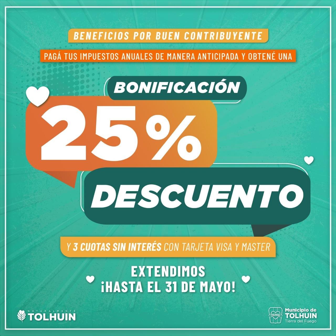 El Municipio de Tolhuin extendió el plazo hasta el 31 de mayo para pagar los impuestos anuales de manera anticipada y obtener un descuento del 25%. Esta oportunidad es válida para el impuesto inmobiliario, la tasa de servicios generales y el impuesto automotor.