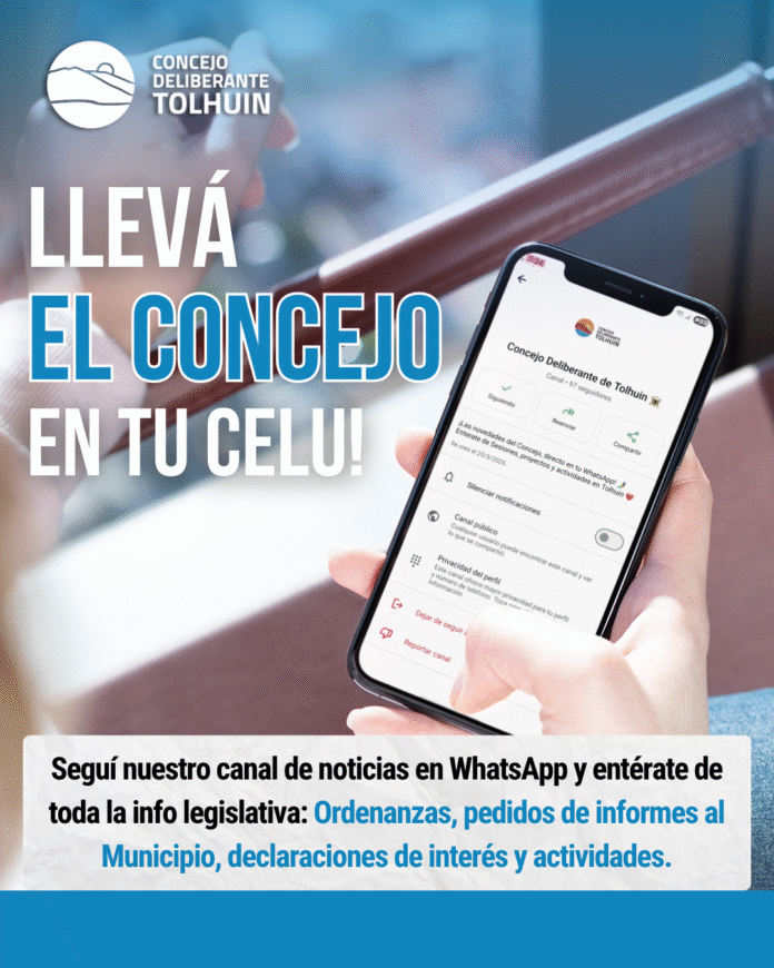 También pueden encontrarnos desde WhatsApp, ingresando a la pestaña “Novedades”, tocando “Explorar canales” y buscando “Concejo Deliberante de Tolhuin”.