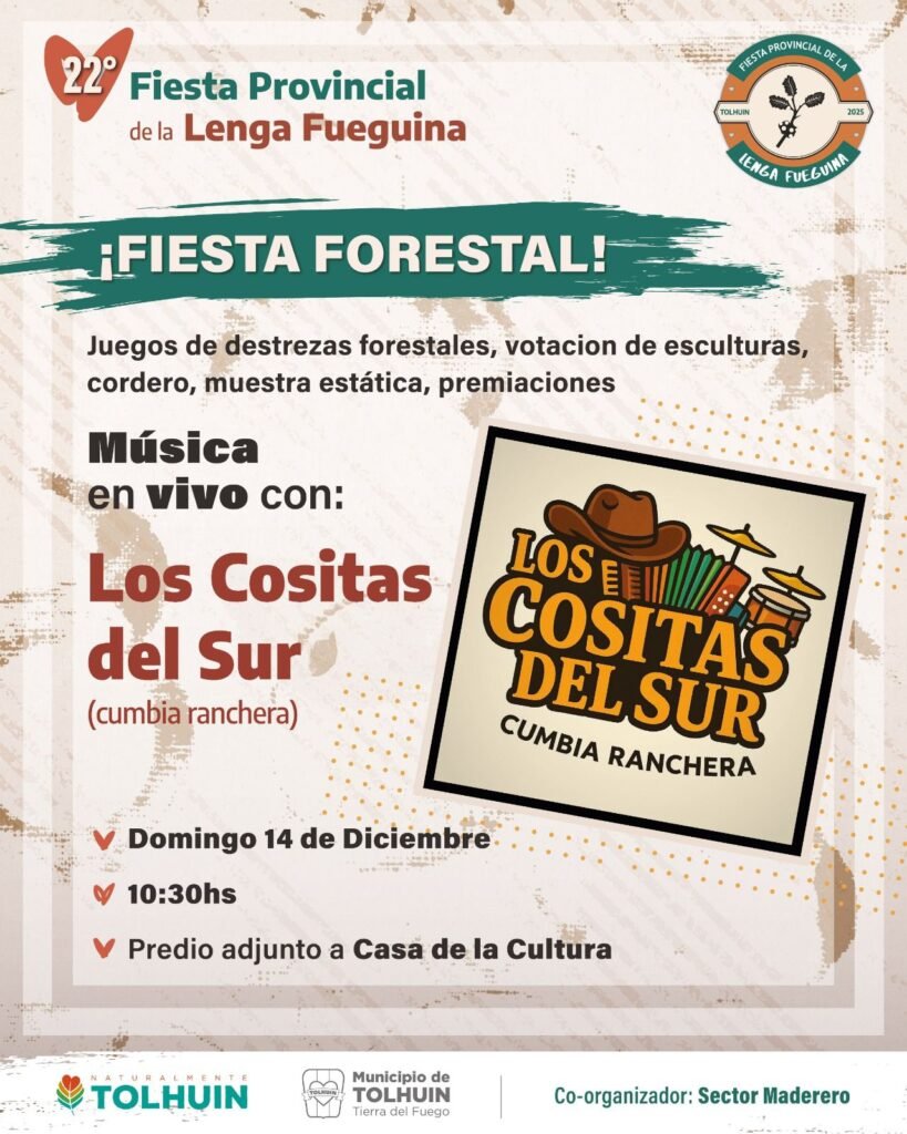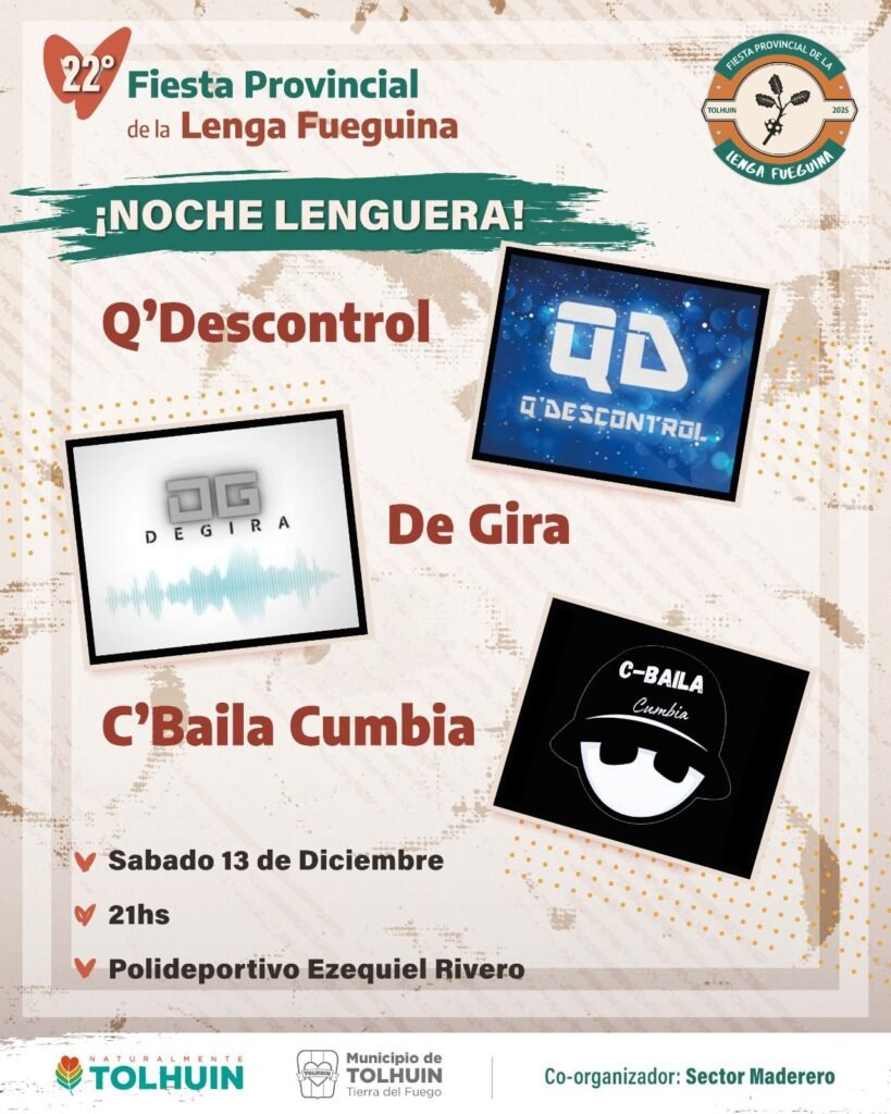 La programación continuará el sábado 13, a las 21 horas, en el Polideportivo Ezequiel Rivero, con la “Noche Lenguera”, un evento musical que contará con las presentaciones de Q’Descontrol Kuarteto, De Gira (Tolhuin) y C’Baila Cumbia. Según lo informado, se trata de una propuesta pensada para promover el encuentro de la comunidad y celebrar el espíritu festivo característico de la ciudad.