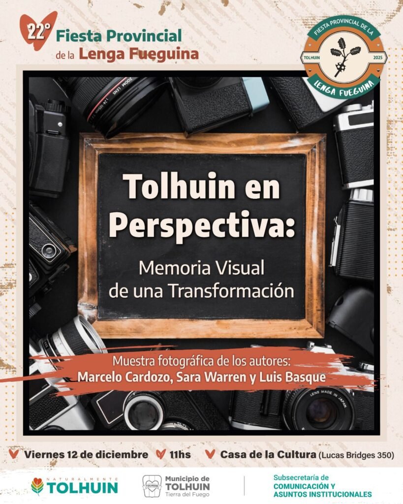 Las actividades comenzarán el viernes 12 de diciembre con la muestra fotográfica “Tolhuin en Perspectiva: Memoria Visual de una Transformación”, que se inaugurará a las 11 horas en la Casa de la Cultura, ubicada en Lucas Bridges 350. La exposición a cargo de la Subsecretaría de Comunicacion y Asuntos Institucionales, reúne obras de Marcelo Cardozo, Sara Warren y Luis Basque, y propone un recorrido por seis años de crecimiento territorial, obras y vida cultural, con un apartado especial dedicado a la propia Fiesta de la Lenga.