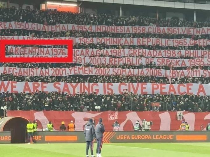 Durante el partido contra el Rangers de Escocia en el encuentro de vuelta de los octavos de final de la Europa League, en el estadio Rajko Mitic Stadium (más conocido como el Marakana de Belgrado), los simpatizantes balcánicos desplegaron un enorme trapo compuesto por largas banderas horizontales, donde escribieron nombres de países y años de conflictos armados y gobiernos de facto históricamente propiciados por la política exterior estadounidense o sus aliados de la OTAN, y allí justamente figura “Argentina 1976”, recordando el último golpe de Estado cívico-militar, campaña de represión política y terrorismo de Estado respaldada por el Plan Cóndor que incluía operaciones de inteligencia y asesinatos de opositores en toda América Latina.