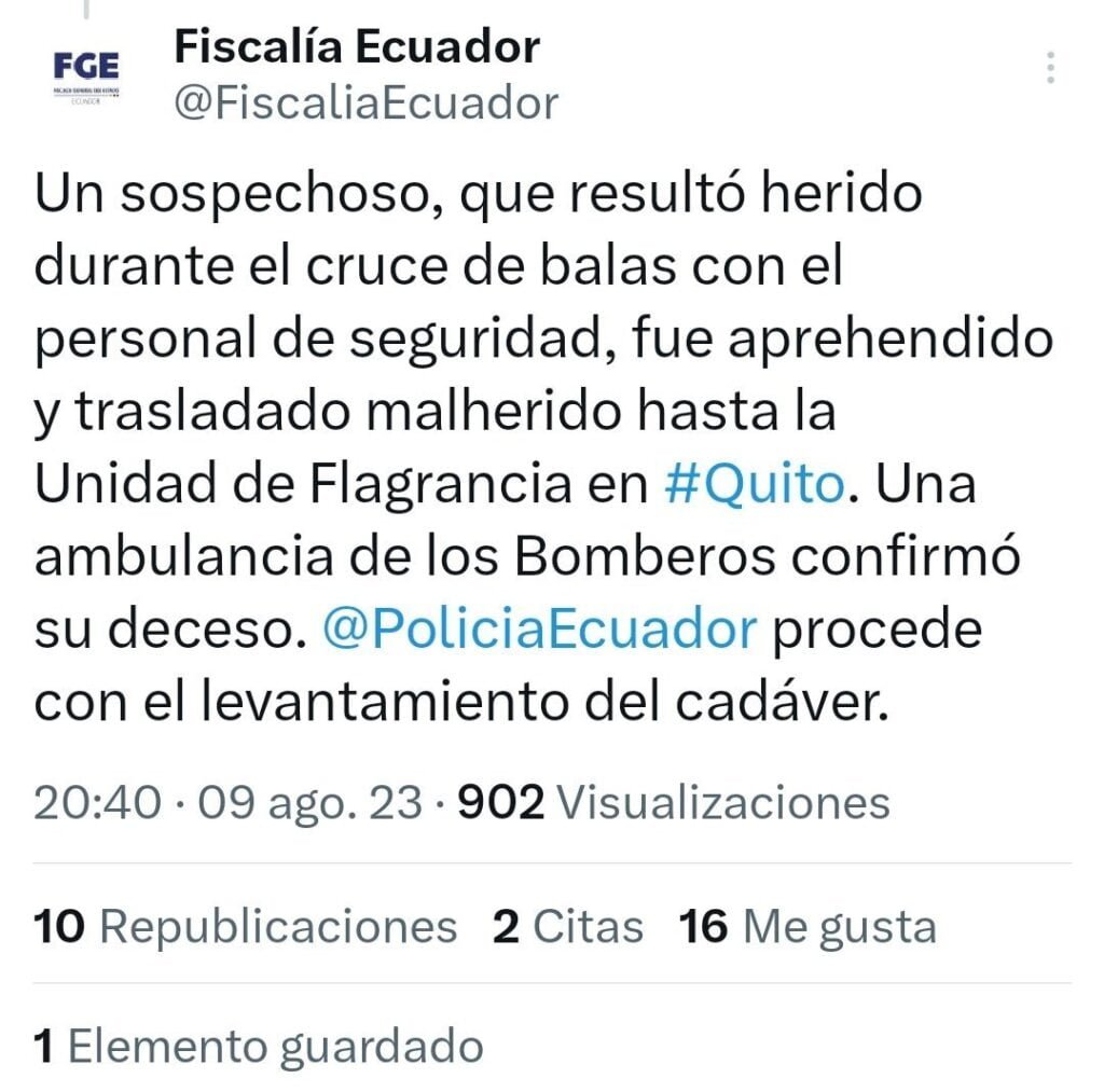 URGENTE: Ha sido ASESINADO al único hombre detenido como sospechoso del magnicidio del candidato a la presidencia de Ecuador, Fernando Villavicencio.